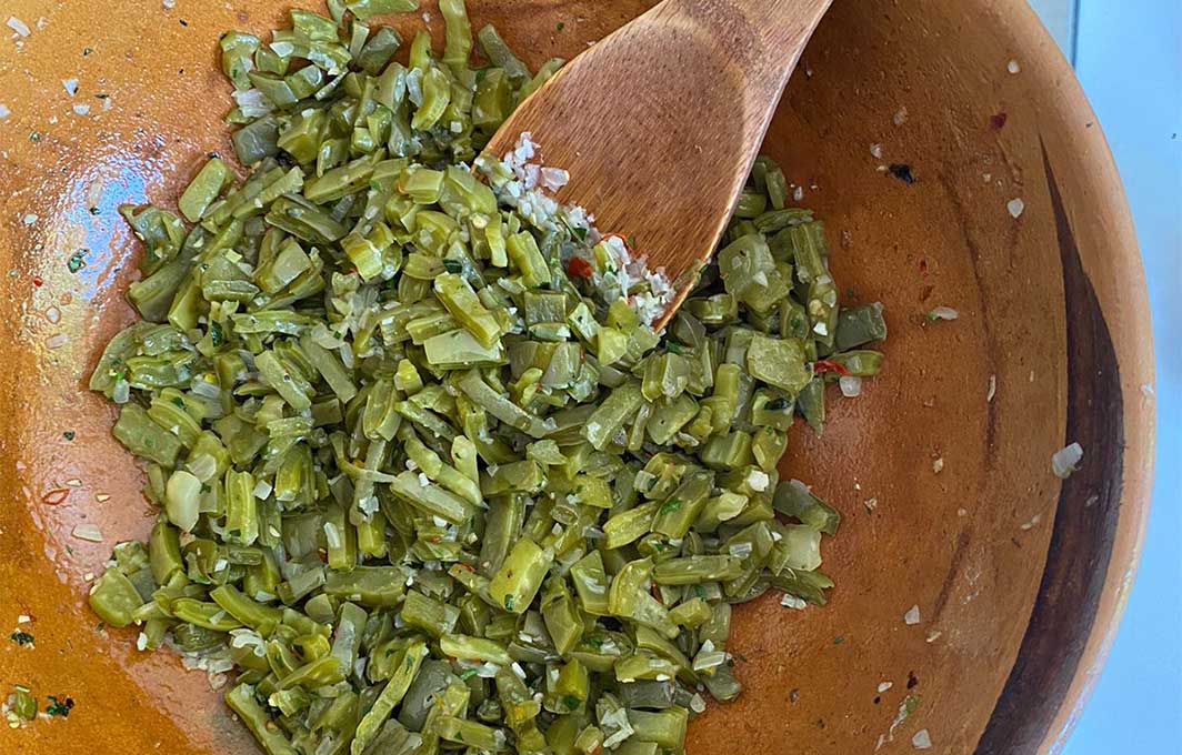 - Se deja freír hasta que la baba de los nopales se va secando, se agrega el cilantro, el orégano y la sal.
