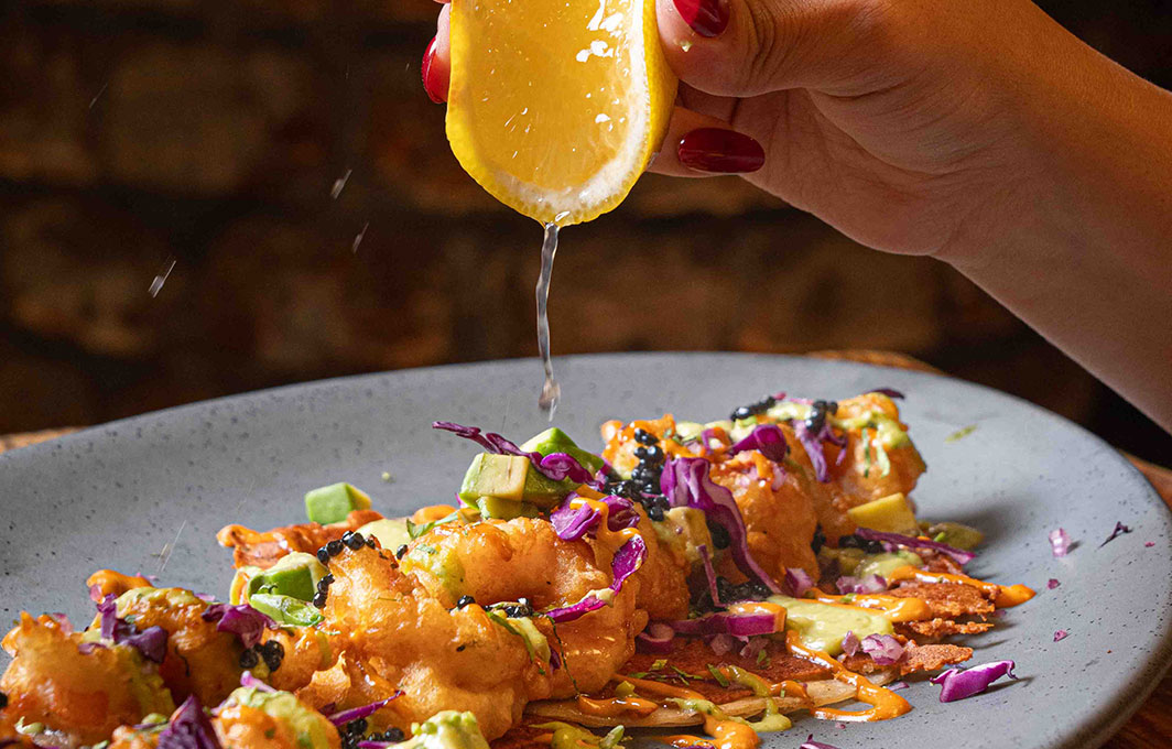 - Cachetada de camarón en tortilla norteña, con frijoles puercos y mayonesa brava (chef Mauricio López).